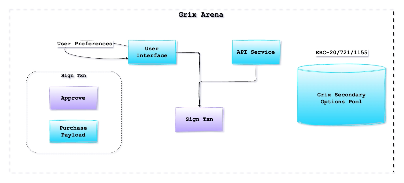 The Arena is a layer designed for user interactions and includes the UI, API, and the Grix intent trading system for DeFi options. Its goal is to provide the user an easy gateway to view the current market, explore different strategies, price quotes, and place orders.