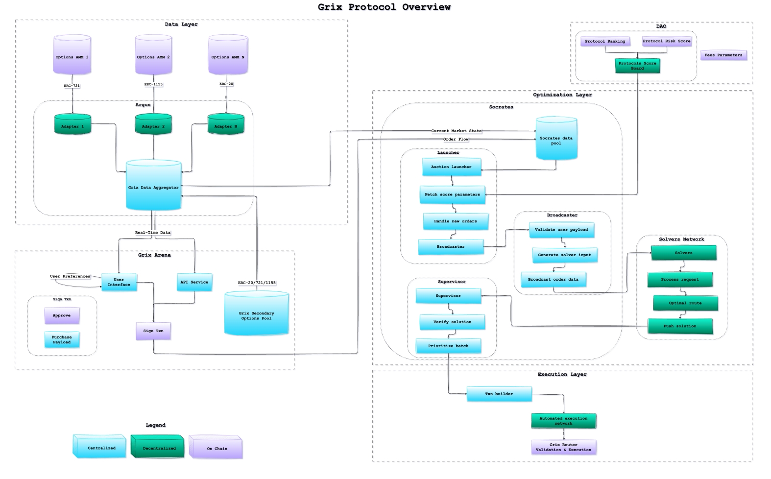 The Data Layer aggregates and indexes the relevant data from all sources (on-chain protocols, market data, existing submitted intents) into Argus, which holds the current state of the DeFi options market, used for computation of the optimal route for the order flow.